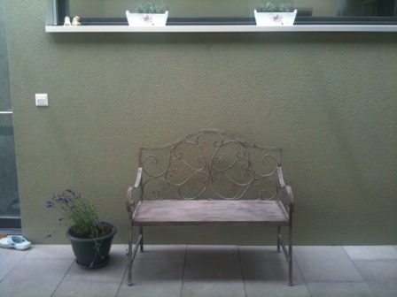 Die Kundin sendete "chüssischlacht" ein Foto einer neu gekauften, antiken Gartenbank aus Eisen vor dem Eingang ihres modernen, gradlinigen Hauses und ein paar Fotos von Servietten mit Mustern, die gefallen würden... (ja - Servietten ;-)